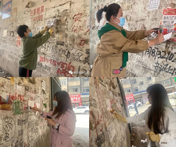 這次活動(dòng)雖小,卻體現(xiàn)著婦聯(lián)干部的為民情懷。由于小廣告的數(shù)量太多而且粘的太牢,給清理工作帶來(lái)了一定的難度,志愿者只能用水噴灑在上面,再用小鏟進(jìn)行清理,由于天氣還沒(méi)有完全回暖,依然很冷,志愿者們卻沒(méi)有抱怨,都積極投入工作,大約兩個(gè)小時(shí)才將指定廣告清理完畢。