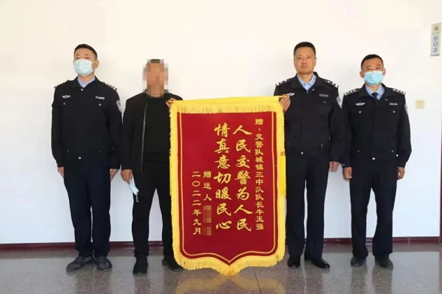 9月中旬,肇東市七道街利民城附近人行道違停三輛翻斗車嚴(yán)重影響行人通行,造成一周姓老年人因躲避車輛而摔倒,如果不及時(shí)處理可能造成其它嚴(yán)重后果。城鎮(zhèn)三中隊(duì)得知情況后立即趕到現(xiàn)場(chǎng),根據(jù)具體情況將三輛車托運(yùn)至停車場(chǎng),消除了安全隱患,得到周邊群眾一片叫好聲。9月25日,被摔倒老人的兒子為感謝交警,送來一面寫有“人民交警為人民 情真意切暖民心”的錦旗表示感謝!