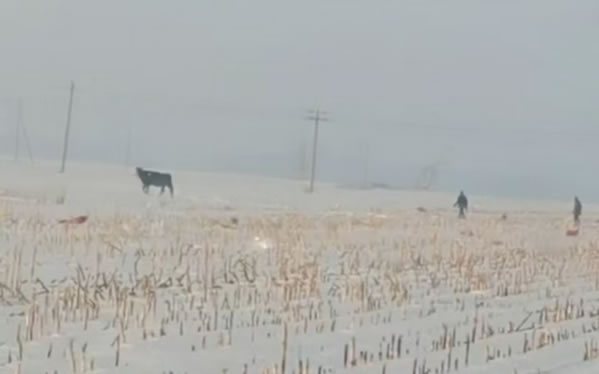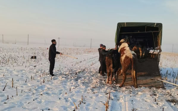 民警了解情況后為了避免瘋牛在村屯里傷害群眾,便立即組織人員開車拿著棒子等工具將瘋牛趕到了屯后的大地里。工作人員幾次試圖靠近瘋牛,但瘋?匆娪腥丝拷蜁(huì)向人沖過來,工作人員在幾次奔跑驅(qū)趕中摔倒在了雪地里。工作人員顧不上個(gè)人安危,但考慮到采取強(qiáng)攻制服瘋牛的策略勢(shì)必會(huì)造成人員損傷,經(jīng)過研究準(zhǔn)備采取智取方式制服瘋牛。經(jīng)過近一小時(shí)的忙碌后,這時(shí)瘋牛的情緒逐漸穩(wěn)定下來了。工作人員見時(shí)機(jī)成熟,慢慢的靠近老牛,并快速的拽住韁繩,將牛趕上了車。最后大伙一起將牛送回了李老漢的家中。