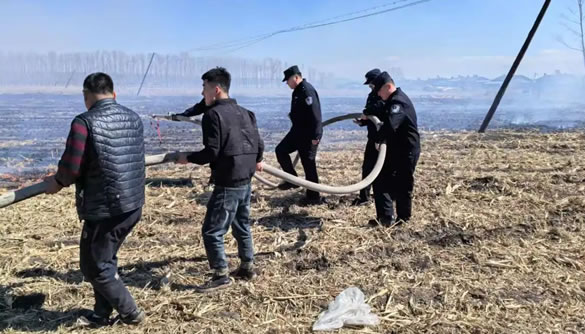 到達現(xiàn)場后,只見玉米地壟溝中的秸稈大面積起火,火勢熊熊,濃煙滾滾。五里明派出所的工作人員沒有絲毫猶豫,迅速展開消防救火工作。李華龍、王宇等四人分工明確,配合默契,一邊疏散周邊群眾,一邊向火場噴水救火。在五里明派出所工作人員的奮力撲救下,火勢得到了初步控制。隨后,肇東市消防大隊工作人員也趕到了現(xiàn)場。兩支隊伍迅速匯合,共同投入到緊張的滅火戰(zhàn)斗中。在大家的共同努力下,經(jīng)過一段時間的奮戰(zhàn),大火終于被成功撲滅。
