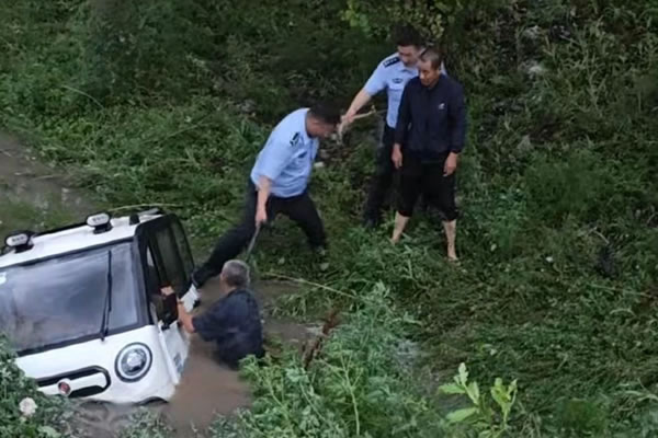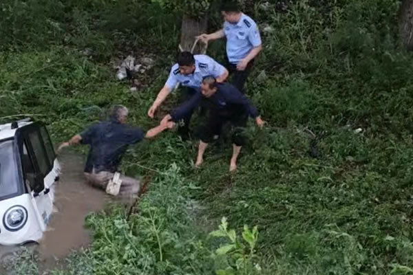 現(xiàn)場(chǎng),一輛電車側(cè)翻在坑內(nèi)水流中,車輛熄火、人員被困,透過車窗能看到有人揮手呼救。民警耐心安撫被困人員的情緒。救援隊(duì)伍兵分兩路,一組民警在過膝的積水中小心翼翼前行,協(xié)助車內(nèi)脫困,另一組民警在路上設(shè)置安全警示標(biāo)識(shí),防止二次事故發(fā)生。由于被困人員所處位置在水域中央,情況復(fù)雜,民警想到拿救援繩進(jìn)行救助,經(jīng)過數(shù)次拋擲,被困人員終于抓住了繩子,民警一點(diǎn)點(diǎn)把被困老人拉上了岸。