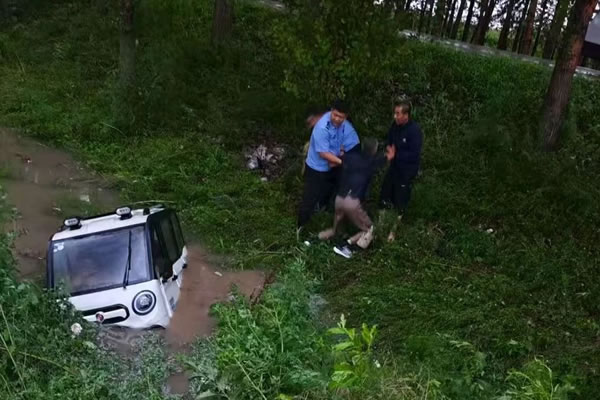 8月2日晚七時(shí)許,狂風(fēng)大雨襲擊了肇東市昌五鎮(zhèn),路面和公路兩側(cè)的坑內(nèi)積水瞬間上漲。此時(shí),從肇東方向駕駛電車回躍進(jìn)鄉(xiāng)的六旬老人劉某,因大雨遮擋視線,再加上路面積水過深,操作失誤將車輛開進(jìn)了S311省道昌五鎮(zhèn)境內(nèi)的大坑內(nèi)側(cè)翻,駕駛員被車輛困在坑內(nèi)齊腰積水中,無法脫身。路過的群眾發(fā)現(xiàn)后立刻報(bào)警,昌五派出所民輔警接警后趕到現(xiàn)場(chǎng)。