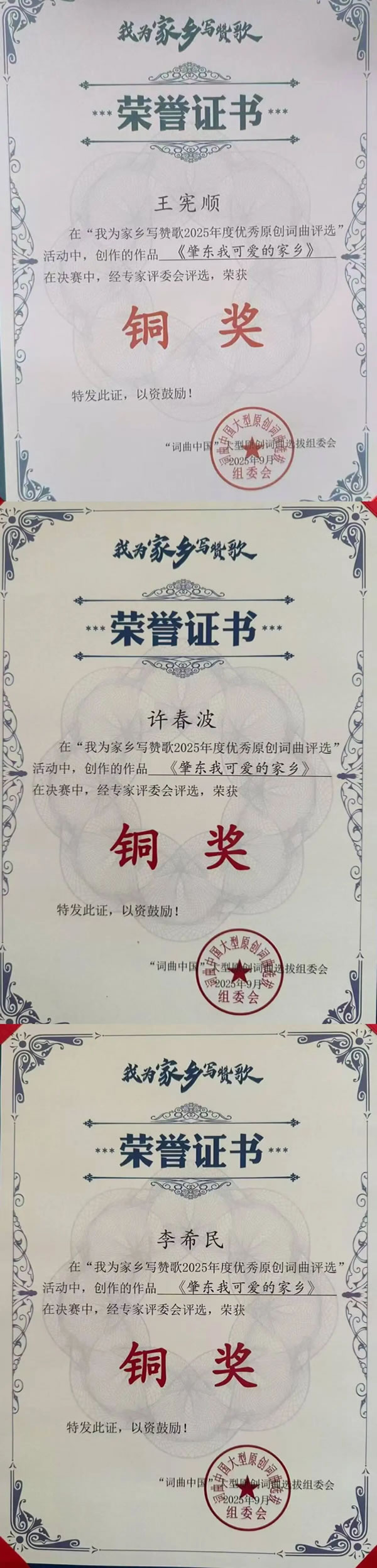 近日,“我為家鄉(xiāng)寫贊歌2025年度優(yōu)秀原創(chuàng)詞曲評選”全國決賽落下帷幕,肇東本土創(chuàng)作團隊交出亮眼答卷——由王憲順、許春波作詞,李希民作曲的《肇東我可愛的家鄉(xiāng)》憑借濃郁的地域風情與動人的情感表達,成功斬獲銅獎。