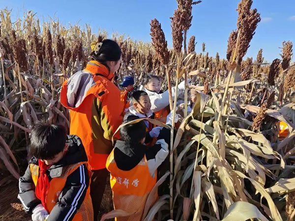 隨后,孩子們來到鶴島農(nóng)莊參與高粱收割實踐。研學(xué)導(dǎo)師詳細(xì)講解高粱的種植歷史、生長周期與多元用途,讓大家全面了解糧食生產(chǎn)過程。在古法收割體驗中,孩子們親身體會 “粒粒皆辛苦” 的含義,還共同宣讀《節(jié)約宣言》,在橫幅上鄭重簽名,許下節(jié)糧承諾。