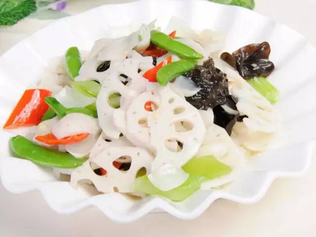 做法:藕、胡蘿卜、木耳、荷蘭豆分別泡發(fā)、洗凈、去皮,分別切片。嫩嫩的荷蘭豆,去掉兩端,不必再切。藕切了泡在滴了白醋的水里,更顯得白凈如玉。分別焯水,藕片待水一滾,微微透了明就好了,別焯過(guò),焯好還要放進(jìn)涼水里。荷蘭豆和胡蘿卜片稍稍多焯一會(huì)兒。鍋內(nèi)入油,煸香蔥花,先加入荷蘭豆和胡蘿卜片煸炒,再加木耳和藕片,加適量鹽調(diào)味就好了。
