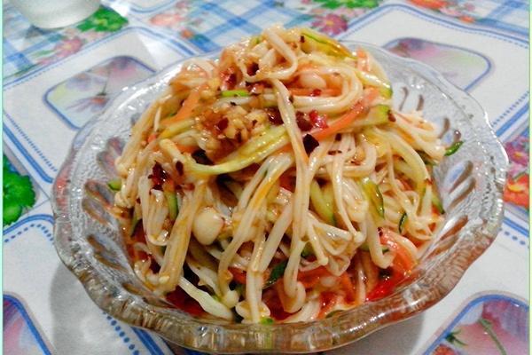 做法:金針菇撕開,凈水洗凈,青椒洗凈切絲,蒜剁成沫。洗凈后的金針菇放入開水中汆燙,撈出,潷出水分;放入切好的青椒絲和蒜末,調入鹽、糖、芥末油和香油。 拌勻后,上桌前淋上紅油,即可。